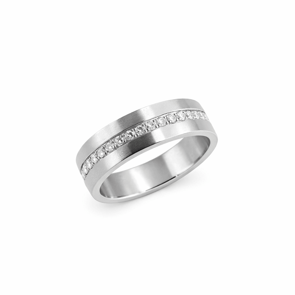 Vacker vigselring i stål. Matt design med en rad glittrande kristaller i mitten.