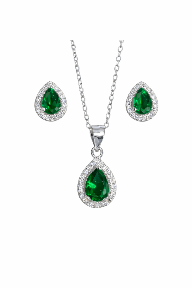 Carmose SET Grön med örhängen och ett halsband i äkta silver 925. Cubic Zirconia center sten omringad av mindre Zirconia stenar. En tidlös design. Finns även att välja i andra färger.