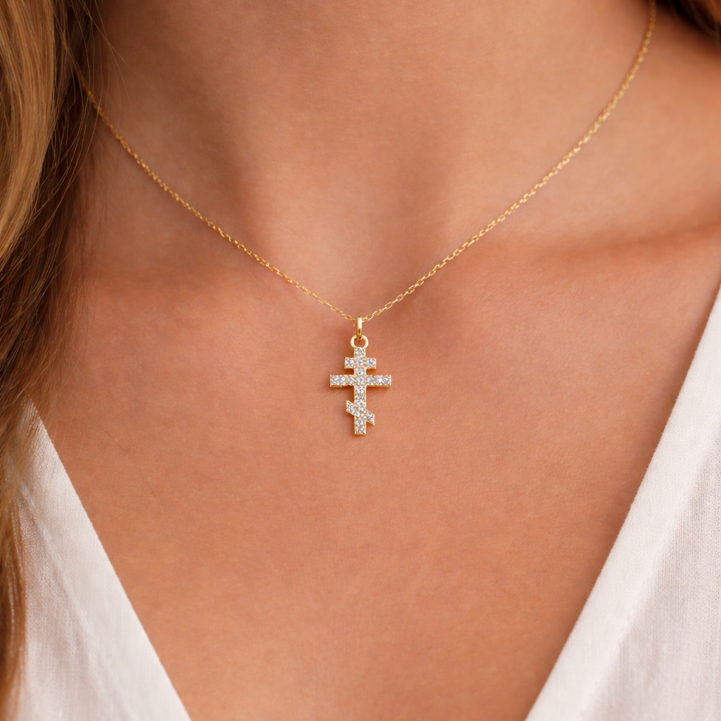 Halsband med kors i sterling silver. 18k guldpläterad. Ortodoxt kors med cubic zirconia kristaller. Korset symboliserar kring liv, död och frälsning i den ortodoxa traditionen. Halsbandet är en rund ankar länk. Längden på kedjan är justerbar.