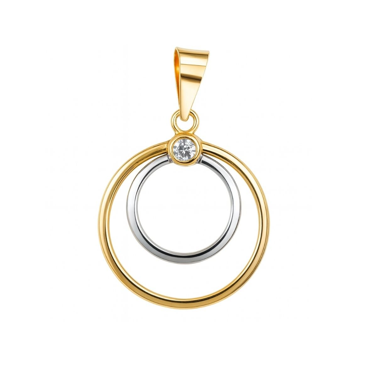 Hängsmycke i tvåfärgat 18k guld. Två blanka cirklar inuti varandra med en glittrande cubic zirconia sten upptill.