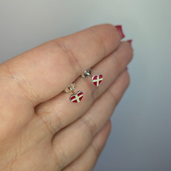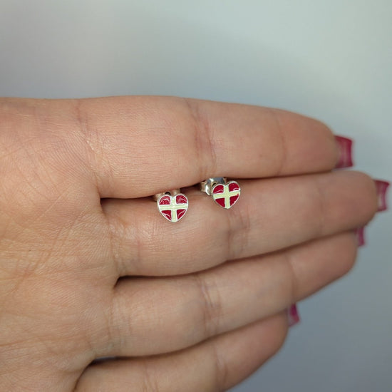 Örhängen hjärtformade i äkta silver. Danska flaggan i design med röd och vit emalj.