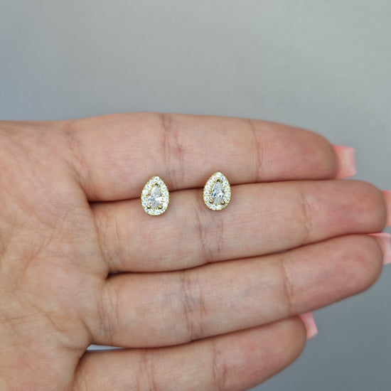 Snygga dropp formade örhängen i 8karat guld. En dropp formad center sten och små stenar runt. Glittrande cubic zirconia stenar.