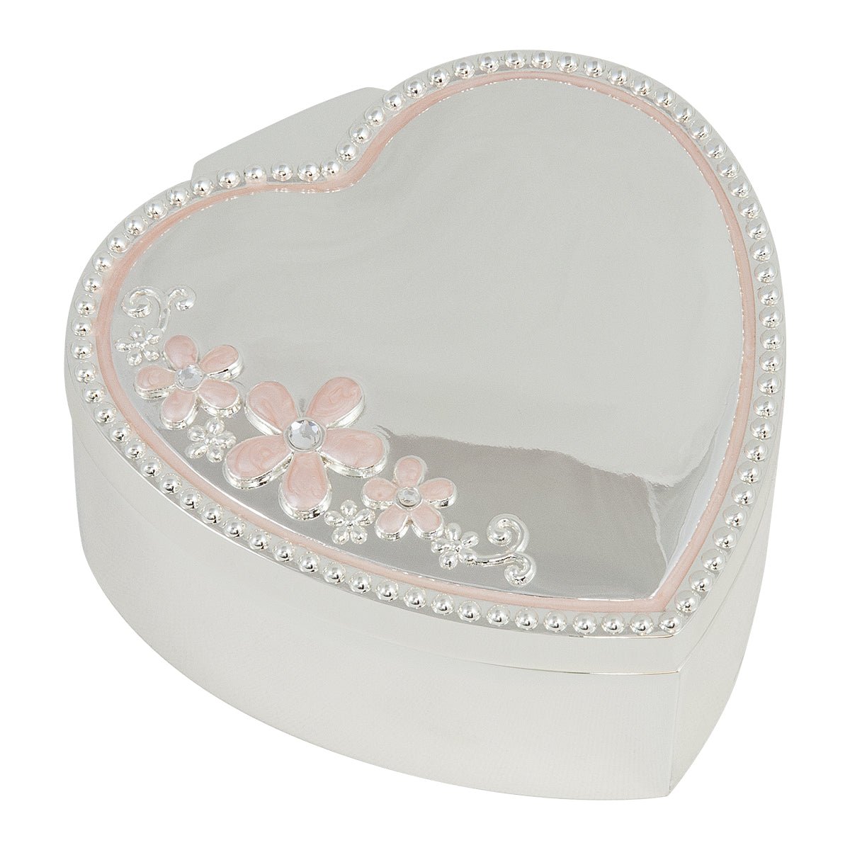 Smyckeskrin i form av ett hjärta i nysilver. Rosa blommor på. Blank i modellen. Gravyrbar, gravera något personligt.
